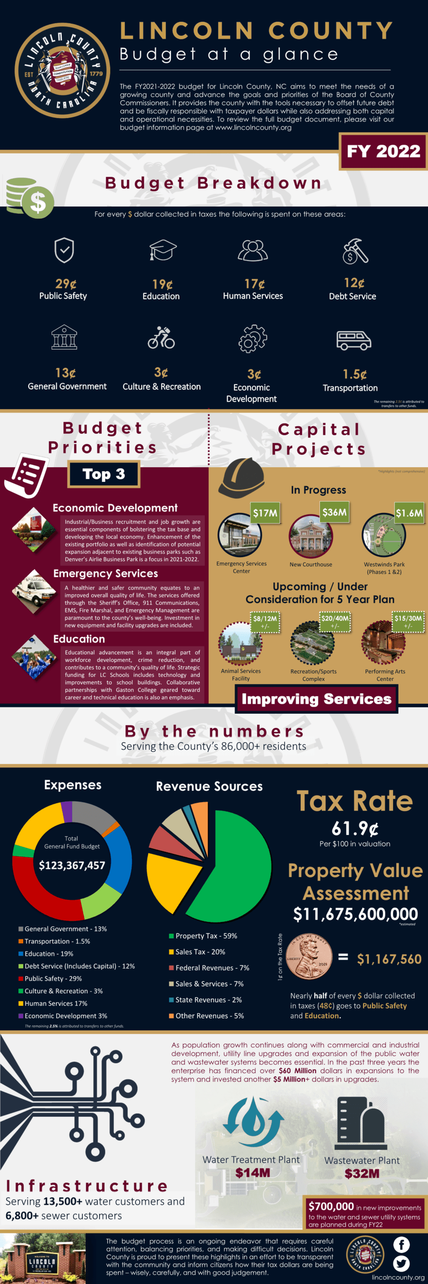 The Budget at a Glance document was designed to help citizens better understand and digest the budget while allowing them to see a breakdown of the tax dollar, the County Commissioners top funding priorities for the year, current and upcoming capital projects, revenues and expenses, updates to infrastructure, and improvement to services all in a visual format. The County Manager's Office and Finance Department collaborated on the first ever document of its kind in Lincoln County in 2021 for the FY2021-2022 budget cycle. We hope it helps highlight what is important to the community and shows that decisions on spending tax dollars are carefully considered and prioritized with good judgement.